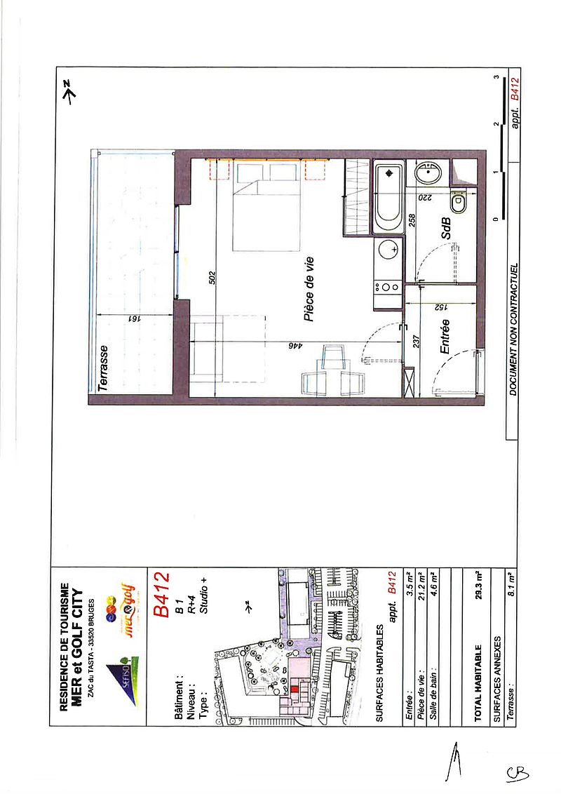 Studio de 29.25m² avec terrasse de 8m², 2°étage de la résidence, orienté côté LAC, il se compose de la manière suivante :
