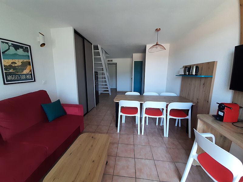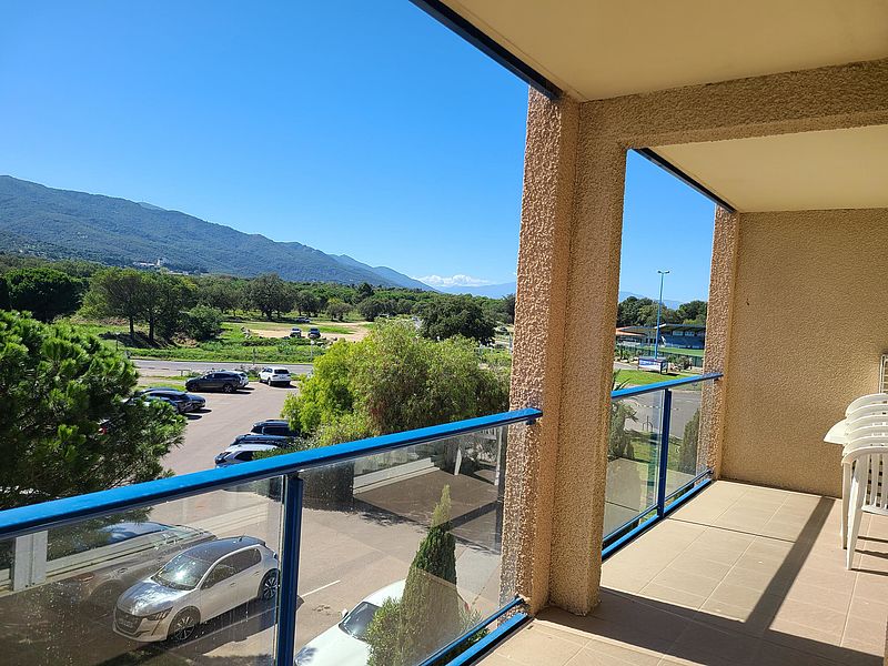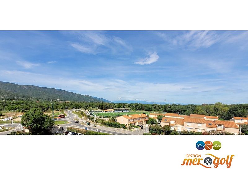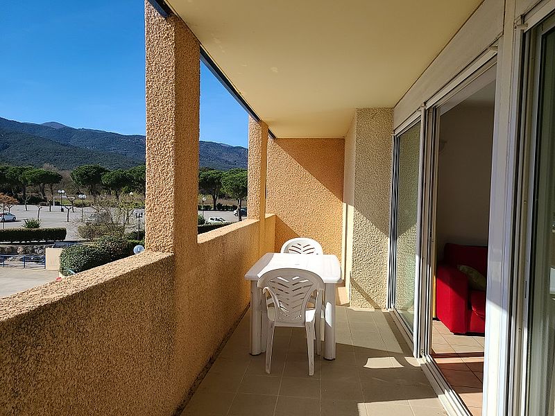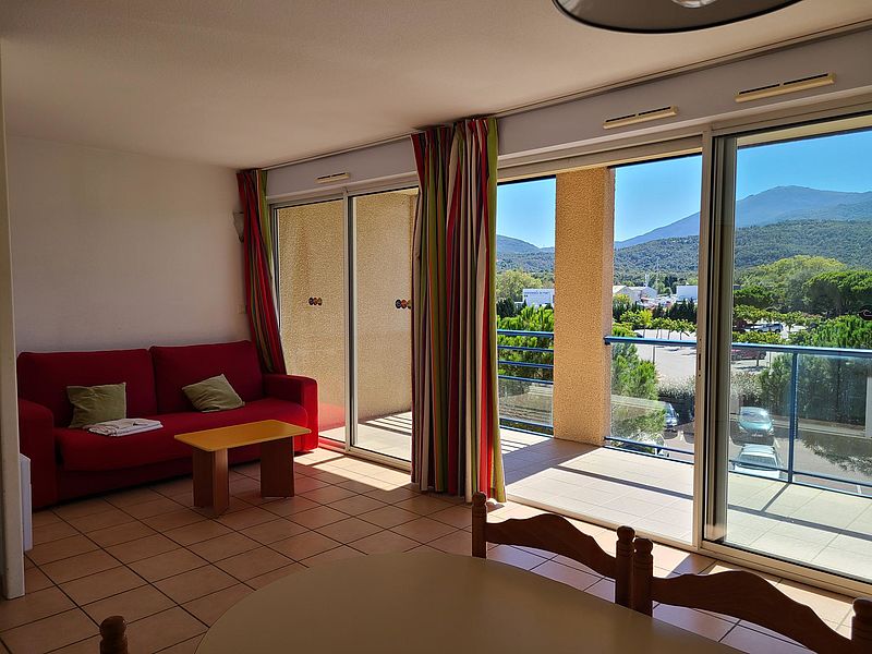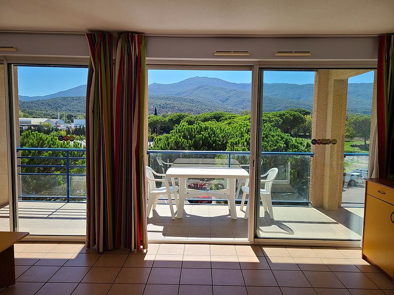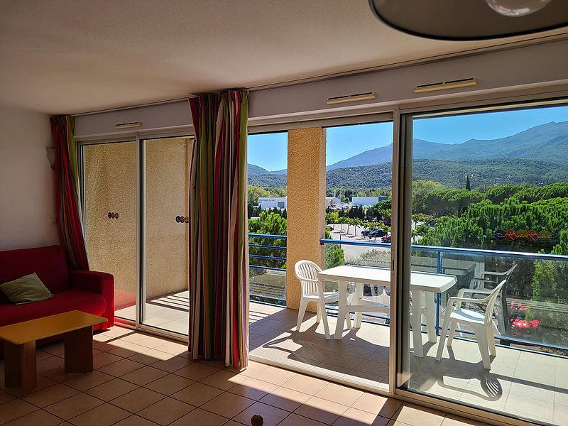d'un coin cabine avec lits superposés, une salle de bains, WC séparé, une chambre et un grand séjour avec kitchenette ouvrant une vaste terrasse de 17 m² offrant une vue imprenable sur les Albères,