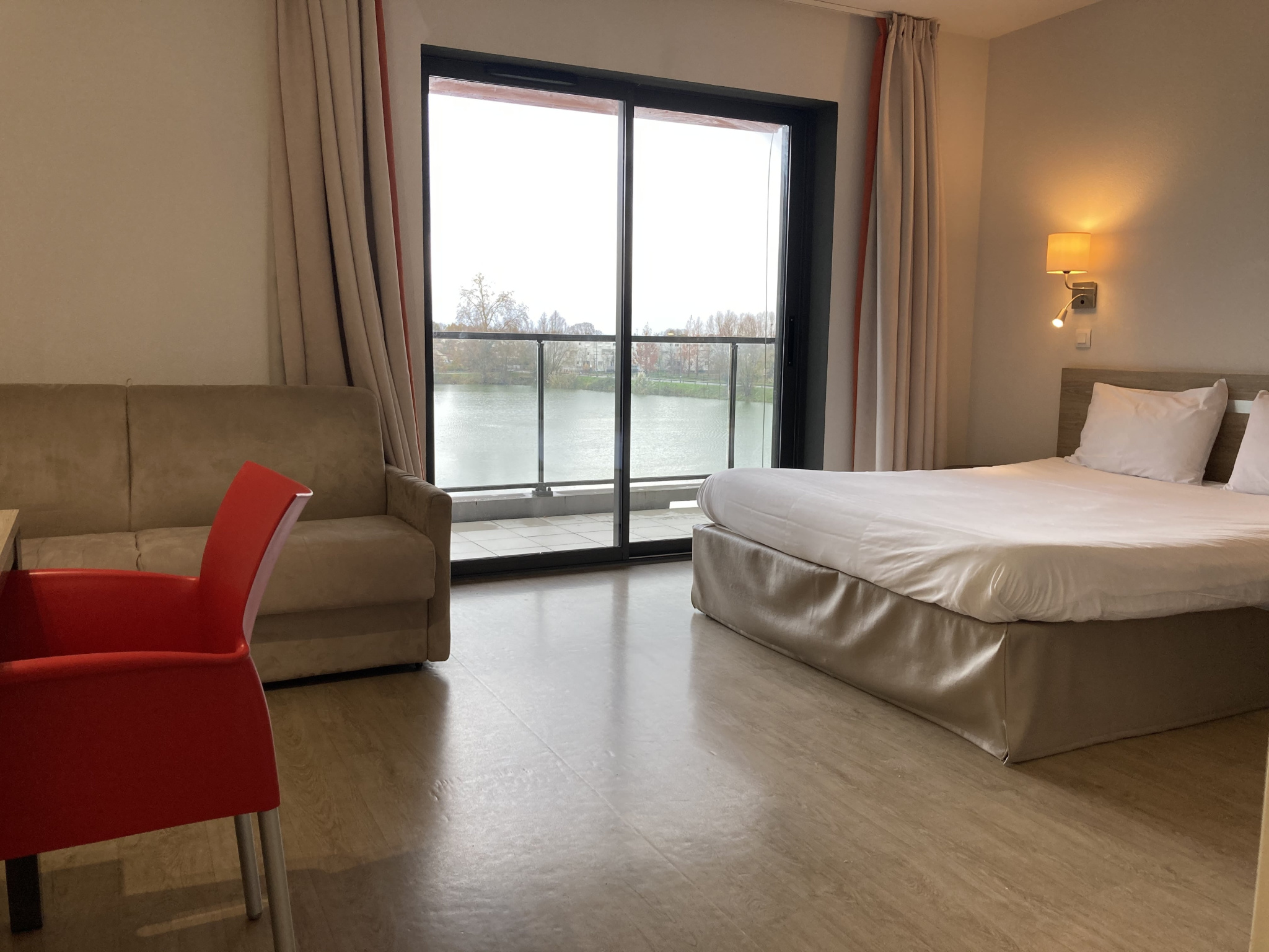 Le bien se compose : un coin cuisine équipé, un espace repas, un lit double, un canapé convertible, une salle de bain avec WC et un balcon de 8.14 m² avec jolie vue sur le Lac